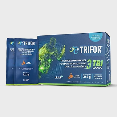Trifor é um suplemento nutricional à base de peptídeos de colágeno (Peptan), colágeno tipo ii não hidrolisado (B2 Cool) e ácido Hialurônico (Haplex) – A associação destes ativos auxilia na manutenção da cartilagem articular – Caixa com 30 sachês de 12,3g, pó sabor Tangerina. Como funciona? – Como um lubrificante, reduzindo a fricção das articulações. – Auxilia no aumento da produção endógena do ácido hialurônico nas articulações. Modo de tomar: Uso adulto. Utilize 1 sachê ao dia. Dissolver o conteúdo em 250ml de água e misturar bem até completa dispersão. Consumir imediatamente após ao preparo. este produto não é um medicamento. não exceder A recomendação diária de consumo indicada na embalagem. mantenha fora do alcance das crianças.